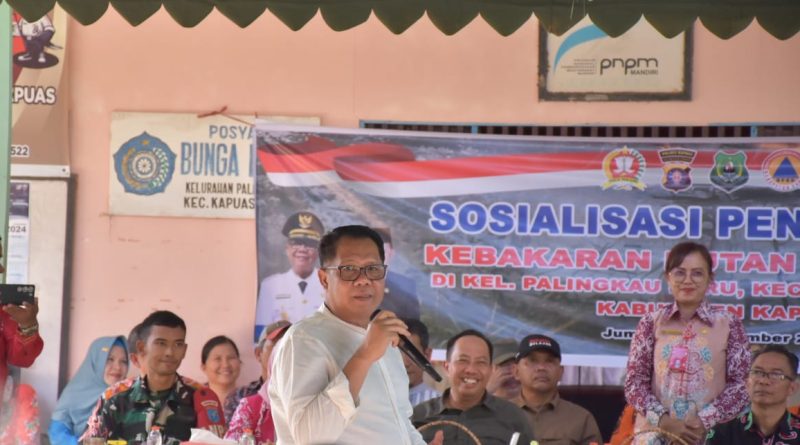 SOSIALISASI – Pj Bupati Kapuas H Darliansjah saat membuka kegiatan Sosialisasi pencegahan Kebakaran Hutan dan Lahan (Karhutla) yang dilaksanakan di halaman Kantor Kelurahan Palingkau Baru, Kecamatan Kapuas Murung, Jumat (20/9/2024).