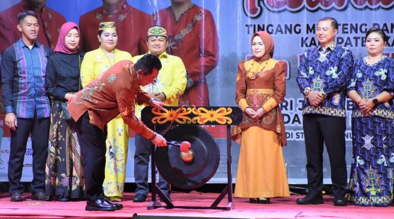 Simbol Pemukulan Gong Sebagai Tanda Resmi Di Buka Festival BudayaTingang Menteng Panunjung Tarung Peringati Hari Jadi Kabupaten Kapuas Ke – 74 Tahun