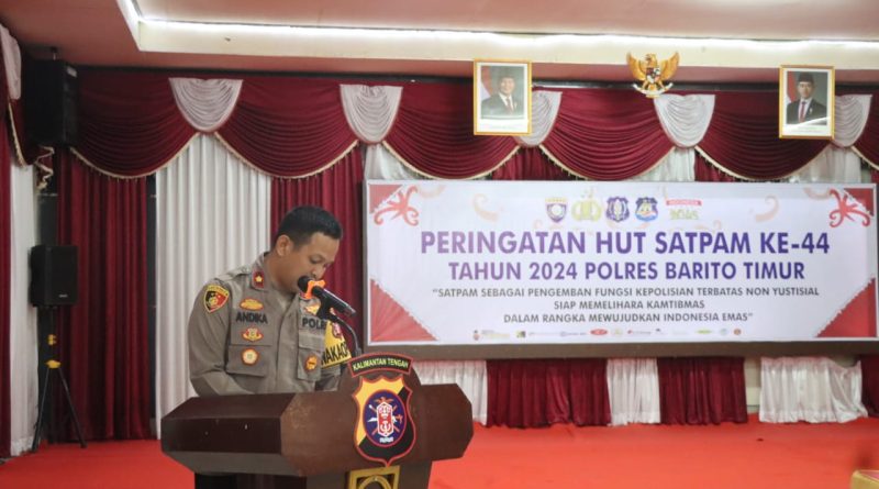 Tamiang Layang (SPIRITNUSANTARA.COM) – Wakapolres Barito Timur, Polda Kalteng, Kompol Andika Rama, S.I.K., memimpin langsung peringatan Hari Ulang Tahun (HUT) Satuan Pengamanan (Satpam) ke-44. Acara ini berlangsung khidmat di Aula Pratisarawirya Polres Bartim pada Rabu (8/1/2025) dan dihadiri oleh Pejabat Utama (PJU) Polres Bartim, pimpinan perusahaan pengguna jasa Satpam, serta anggota Satpam dari berbagai instansi di wilayah Barito Timur.